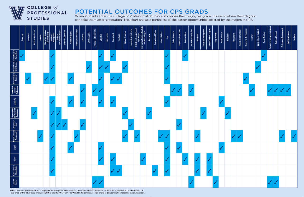 Every student is concerned about how their chosen major can impact their career path. At CPS, we want to make sure your choices in the classroom put you on the right path to finding the perfect role in your desired industry. Our team, along with the experts at Villanova's Career Center, built a helpful infographic to help you connect your education and your professional aspirations.